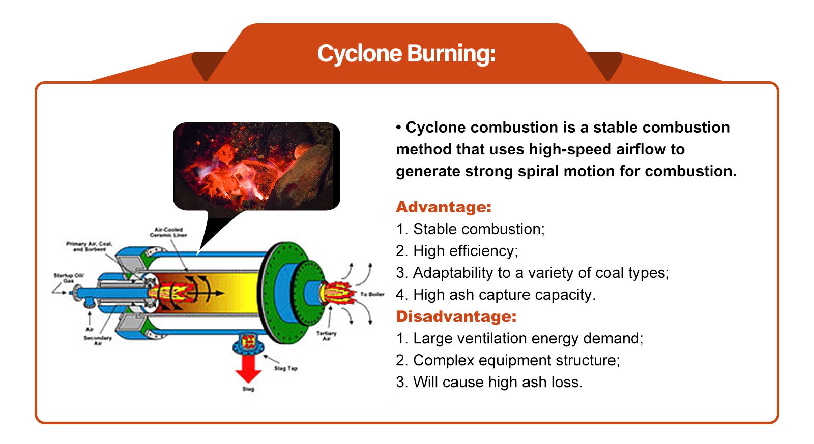 Cyclone combustion is a stable combustion method in which air and fuel enter the combustion chamber in a tangential direction, where a high-speed airflow is formed, producing a strong spiral motion for combustion. The advantages of this method include stable combustion, high efficiency, adaptability to a variety of coal types and high ash capture capacity. However, it requires a large amount of ventilation energy and the equipment structure is relatively complex, and when high-ash content coal is used, it may result in greater ash loss.