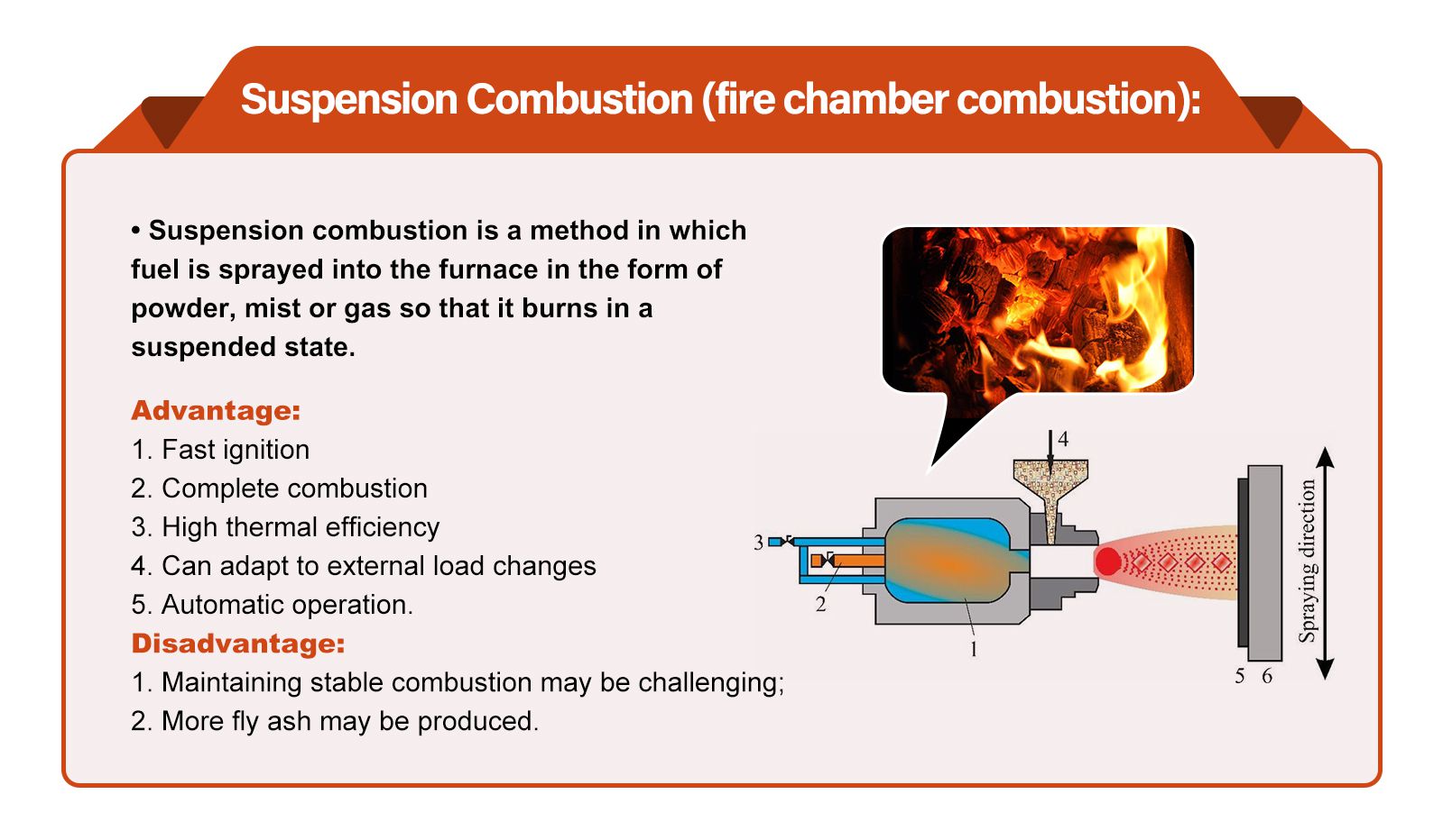 Suspension combustion is to spray fuel into the furnace in the form of powder, mist or gas together with air, and then burn it in a suspended state in the tall furnace. This method has the advantages of rapid ignition, complete combustion, high thermal efficiency, adaptability to external load changes, and automated operation. However, it is sometimes difficult to maintain combustion stability and more fly ash may be produced.