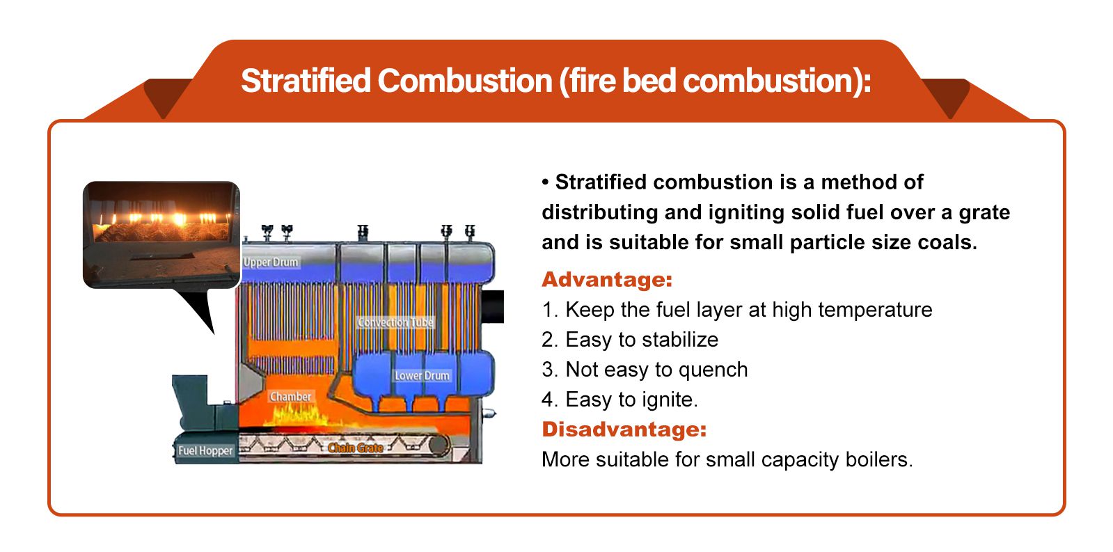 Stratified combustion is a method in which solid fuel is distributed on the grate at a certain thickness and then ignited. This combustion method is generally suitable for various types of coal and has relatively low requirements on particle size. However, if there is insufficient oxygen supply or insufficient mixing of air and fuel, incomplete combustion may result, reducing combustion efficiency. Although stratified combustion has the advantages of maintaining a high temperature in the fuel layer, being easy to stabilize, not easy to flame out, and easy to ignite, it is more suitable for small-capacity boilers.