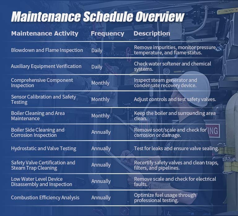 Blowdown and Flame Inspection | Daily | Remove impurities, monitor pressure, temperature, and flame status. |